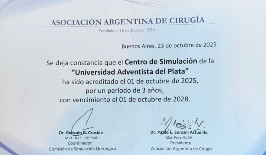 El área de Simulación laparoscópica del Centro Interdisciplinario de Simulación en Salud de la Universidad Adventista del Plata (UAP) recibió la acreditación de la Asociación Argentina de Cirugía, un reconocimiento que posiciona a la institución como referente nacional en la formación de futuros cirujanos.