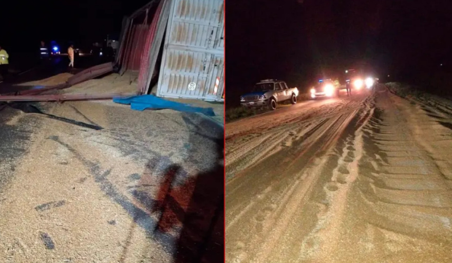 El conductor de un camión perdió el control del rodado y volcó su carga de cereales sobre el kilómetro 68 de la Ruta Provincial 11, entre las localidades de Las Cuevas y Molino Doll. Como consecuencia del accidente, que se registró en la madrugada de este lunes, afortunadamente, no se reportaron personas lesionadas; pero sí importantes daños materiales.