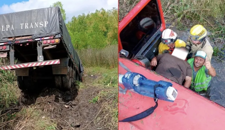De acuerdo al informe de los Bomberos Voluntarios de Ceibas, uno de los camiones terminó sumergido en una zona de bañados, luego de chocar contra un poste del tendido eléctrico de alta tensión, lo que dejó cables sobre el rodado y generó una situación de alto riesgo.