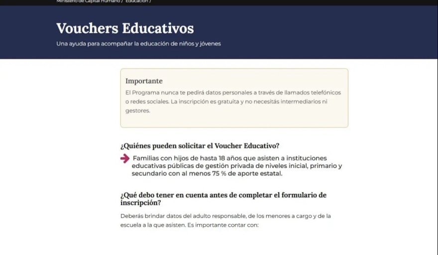 El sitio oficial voucherseducativos.educacion.gob.ar detalla los requisitos y el procedimiento de inscripción, y que “debe ser realizado por uno de los responsables parentales”. Para comenzar el proceso es necesario que el adulto responsable se registre en la app Mi Argentina, seguidamente complete los datos solicitados en la plataforma de Vouchers hasta culminar la inscripción.